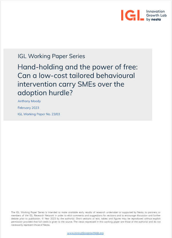 This RCT sought to test whether businesses could be nudged into using a cloud-based system to improve the efficiency of invoice processing. All participants in the trial were offered access to the system free of charge for a 12-month period, with a treatment group receiving weekly email reminders to make use of the system. In the event, few businesses made significant use of the new technology, with no detectable differences between the treatment and control groups. The lack of adoption was due to a combination of lack of need among those that signed up, delays in launching the platform, and the incorporation of similar functionality into leading accountancy software packages during the period when the trial was being carried out.